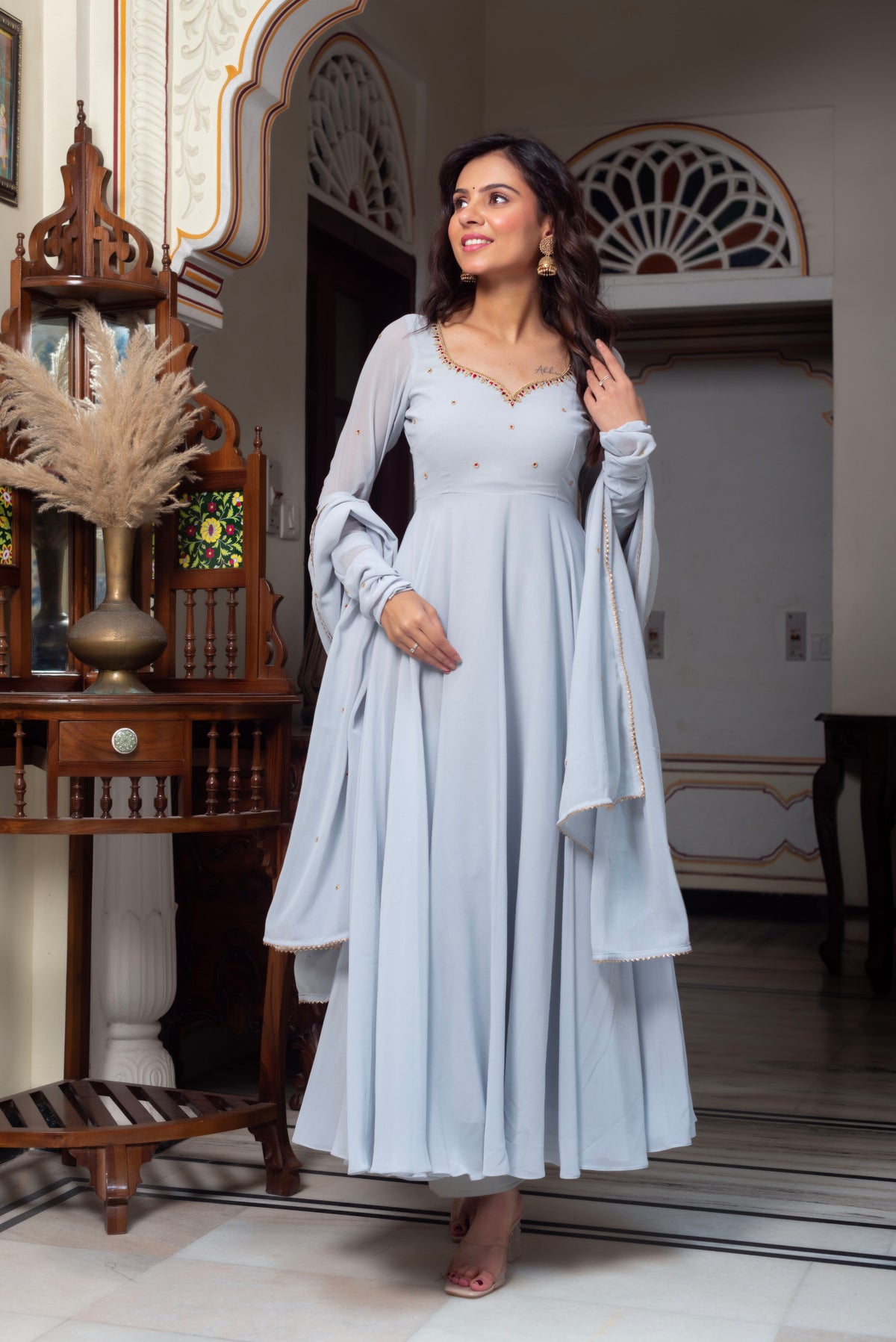 Model Wearing size: SmallTop: Georgette With Cotton LiningBottom : CottonDupatta Fabric: Georgette Suit Length : 50 inchBottom: 39 inchProduct with side zip.