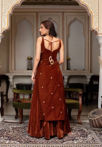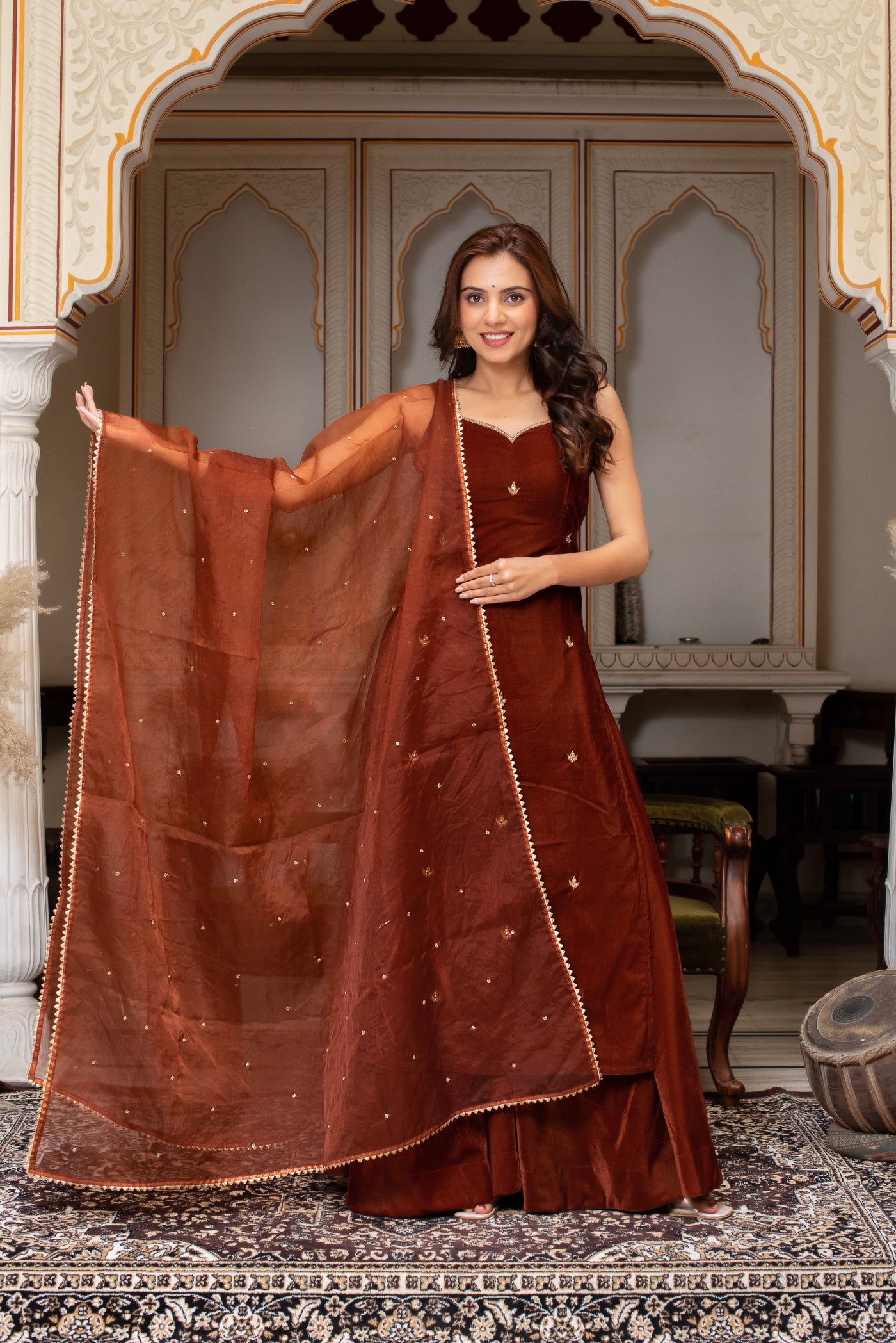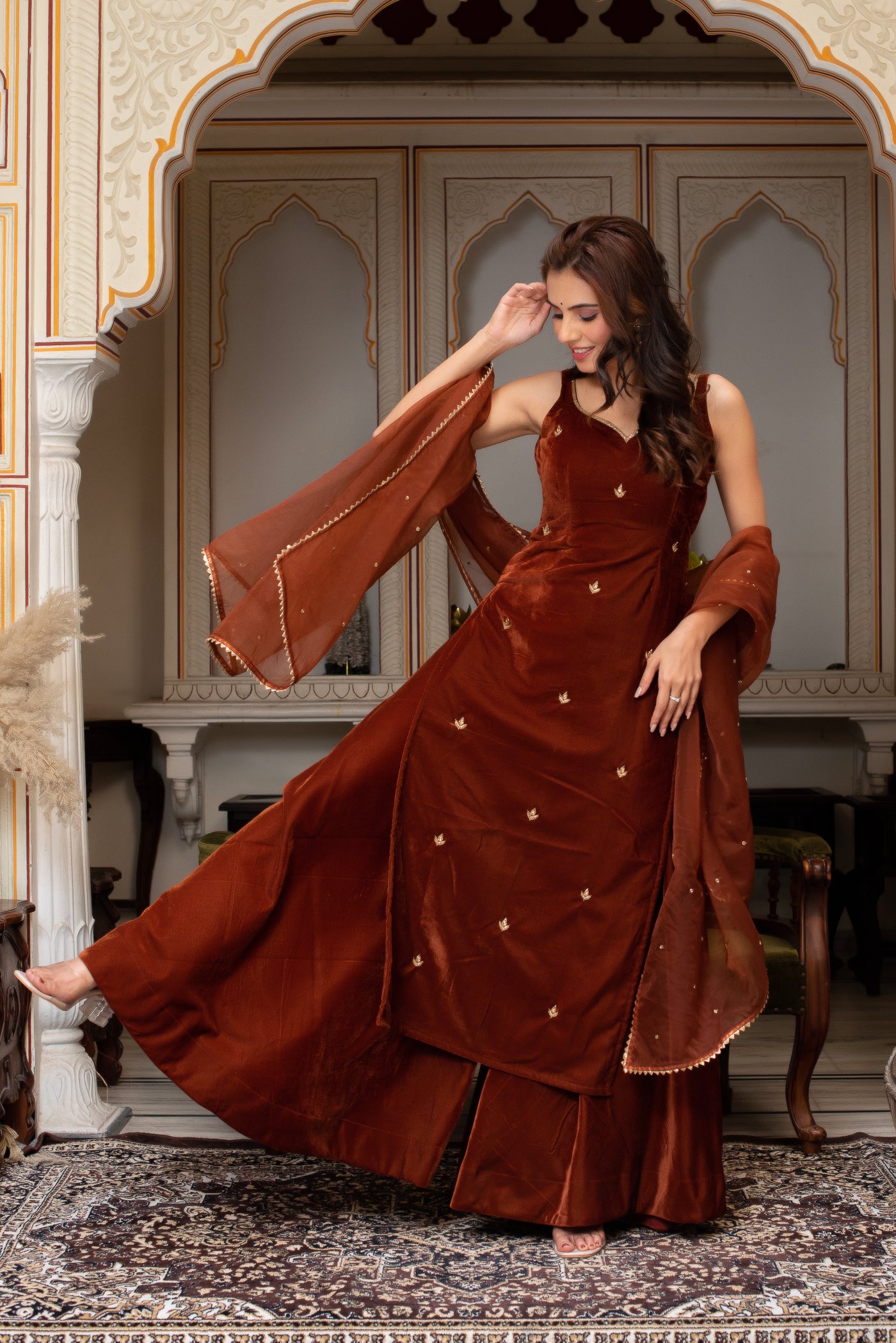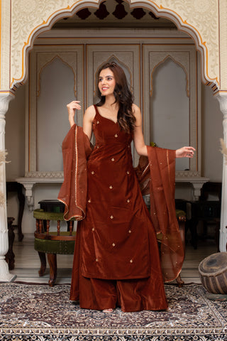 Model Wearing size: SmallTop: Velvet With Cotton LiningBottom : VelvetDupatta Fabric: OrganzaSuit Length : 48 inchBottom: 39 inchProduct with side zip.